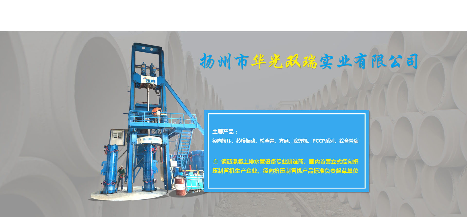 ????????揚州市華光雙瑞實業有限公司,位于中國歷史文化名城揚州市東郊江都區丁伙工業園區,公司成立于2000年10月,是一家專門致力于鋼筋混凝土排水管生產裝備的設計開發、加工制造、銷售服務的專業制造商。公司2016年度被授予全國建材機械產品定點生產企業,2017年度被授予中國混凝土與水泥制品協會會員單位,江蘇省認定企業技術中心,江蘇省研究生工作站,揚州市水泥制品工程技術研究中心,先后承擔過國家火炬計劃項目一項,省科技項目二項,揚州市重點研發項目一項。公司擁有自主知識產權36項(發明專利6項,實用新型專利30項),公司研發的13種產品榮獲江蘇省高新技術產品稱號。公司產品有立式徑向擠壓制管機系列、芯模振動制管機系列、檢查井系列、方涵系列、自動變徑滾焊機系列、PCCP系列、綜合管廊系列。核心產品立式徑向擠壓機2014年度榮獲混凝土與水泥制品行業技術革新一等獎,2015年度獲江蘇省機械工業科技進步二等獎,2016年度獲全國建材行業技術革新一等獎,預制混凝土檢查井生產線榮獲混凝土與水泥制品行業2017年度技術革新二等獎,2011年度立式水泥制管成型機獲混凝土與水泥制品行業技術革新三等獎。公司還是國內首套立式徑向擠壓制管機的生產企業,該產品2012年起填補了國內同類產品的空白,公司2013年被國家建筑材料工業機械標準技術委員會批準為《鋼筋混凝土排水管 芯模振動制管機》《水泥制品用鋼筋混凝土管排水管鋼筋骨架滾焊機》的行業標準制定單位,2017年11月被國家建筑材料工業機械標準技術委員會批...